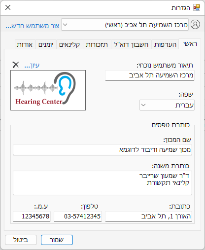בתחילת השימוש בתוכנה הגדירו את פרופיל המכון שלכם. בסרגל הכלים העליון בצידו השמאלי של המסך לחצו על הגדרות, ובמסך הבא עדכנו את שם המכון, בחרו לוגו ועצבו את הכותרת העליונה של כל טפסי בדיקות השמיעה. כל ההגדרות נשמרות בהתאם לפרופיל הנבחר. תוכלו ליצור משתמש חדש אם אתם עובדים עם מספר סניפים. אם אתם מדפיסים את הבדיקות שלכם על דף שמכיל לוגו, תוכלו להגדיר בלשונית העדפות הסתרה של הכותרת העליונה.